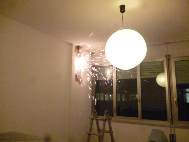 Ma per non soccombere passivamente, mi attivo e  fotografo curiosa le scintille che escono dal buco tra cucina e studiolo, i due giovanottoni e li  ascolto  mentre uno fischietta La vie en rose e l’altro  Lucean le stelle .