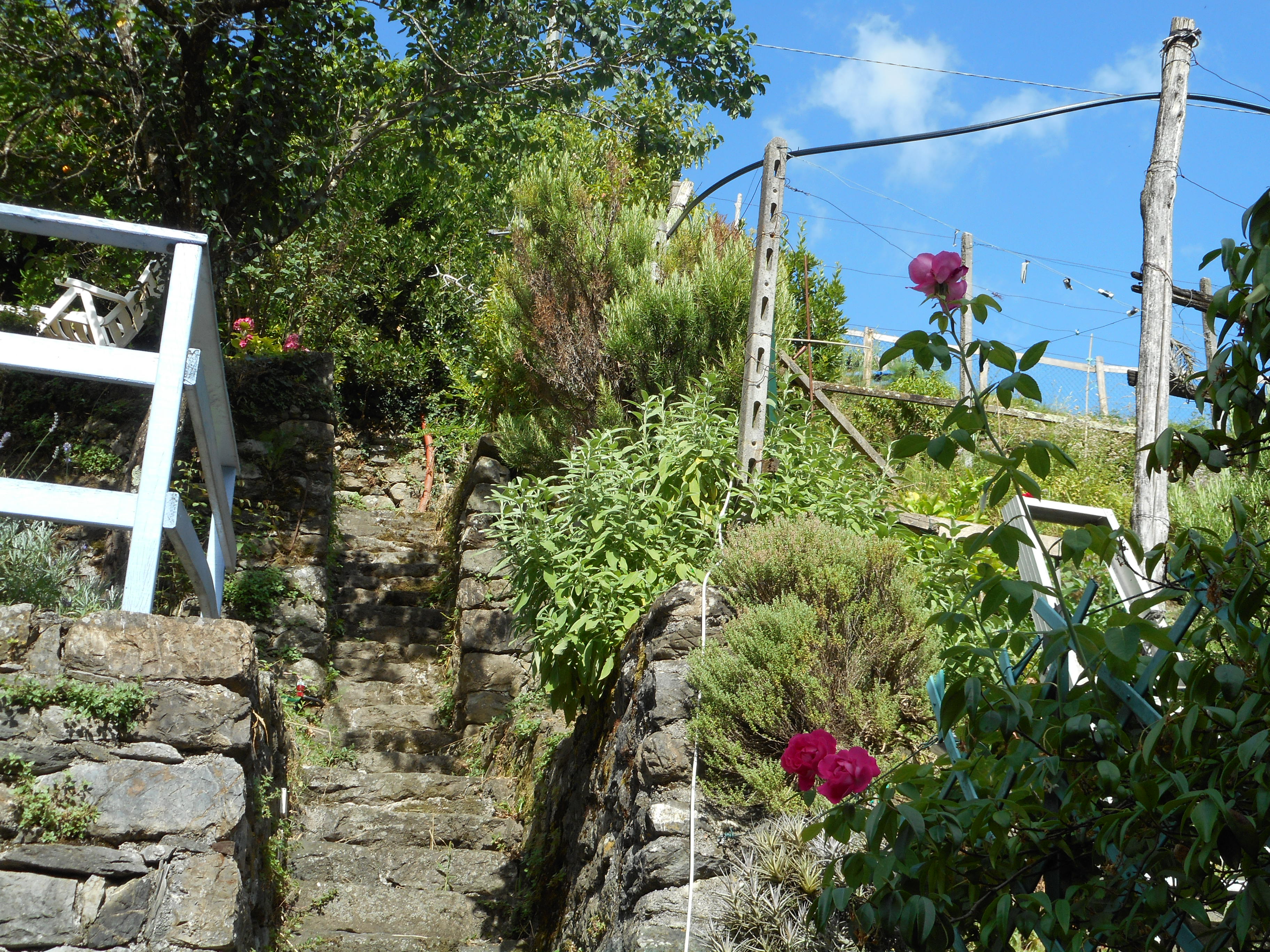 davanti alla cucina ci possiamo riposare tra gli effluvi della salvia del vicino e del gelsomino. Se vogliamo accedere al prato ecco la scaletta di quasi quaranta  gradini, vetusti, forse di pietre del Cinquecento, che portano senza ringhiera alla prima balza dove ci sono il  casotto per gli attrezzi, un caco, un  glicine e lavanda. Ma ancora occorre salire se si vuole sdraiarsi sulla comoda sdraio ad ammirare la palma, il nespolo,l’alloro, l’atmosfera mediterranea.