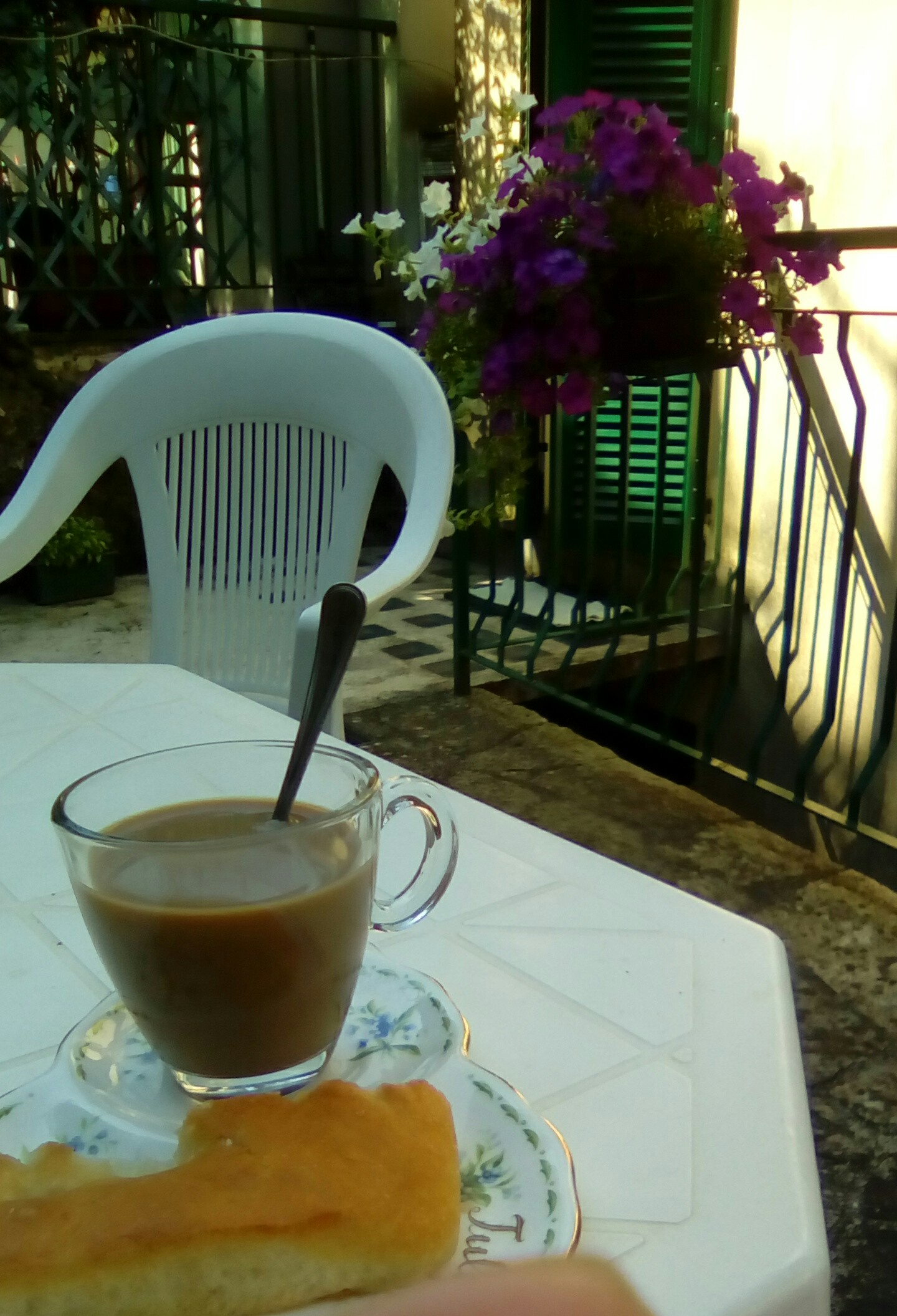 Io salgo la scaletta che lei sempre guarda dalla porta finestra della cucina – come se fosse il paradiso – apro l’acqua per innaffiare l’ortensia, mi siedo sulla sdraio e ascolto, guardo, assaporo allori giganti, palma quasi da Martinica, belle di notte che crescono, e uccellini canori, più tortore tubanti (lasciamo però perdere le zanzare!!!). Mimilla è felice ed io lo sono di riflesso. Si siede sul tavolino d’ardesia e sa che in quel momento lei è la Padroncina del regno vegetale di via Marrè