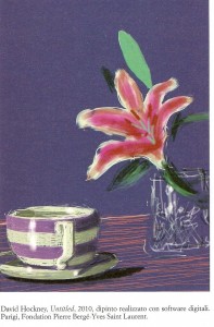 Già il libro di Mauro Covacich  di cui vi ho parlato giorni fa mi spiega qualcosa, ma ancor di più sto capendo ed imparando come appprezzare l’arte contemporanea seguendo le lezioni che l’esperta  Giovanna Nicoletti tiene all’Università della Terza età . Chiarissima, appassionata l’altro giorno mi ha fatto amare David Hockney, settancinquenne che sta dipingendo usando la tecnologia dell’I-pad. Poi naturalmente tutto viene trasposto su tela o su tele piccole avvicinate come pezzi di un puzzle. David Hockney è felice dei supporti digitali perchè può creare sempre e ovunque e tutto ciò che è elettronica, tecnologia computeristica avanzata lo mette di buon umore. Insomma su una lavagnetta digitale egli disegna e colora direttamente con la punta delle dita.
