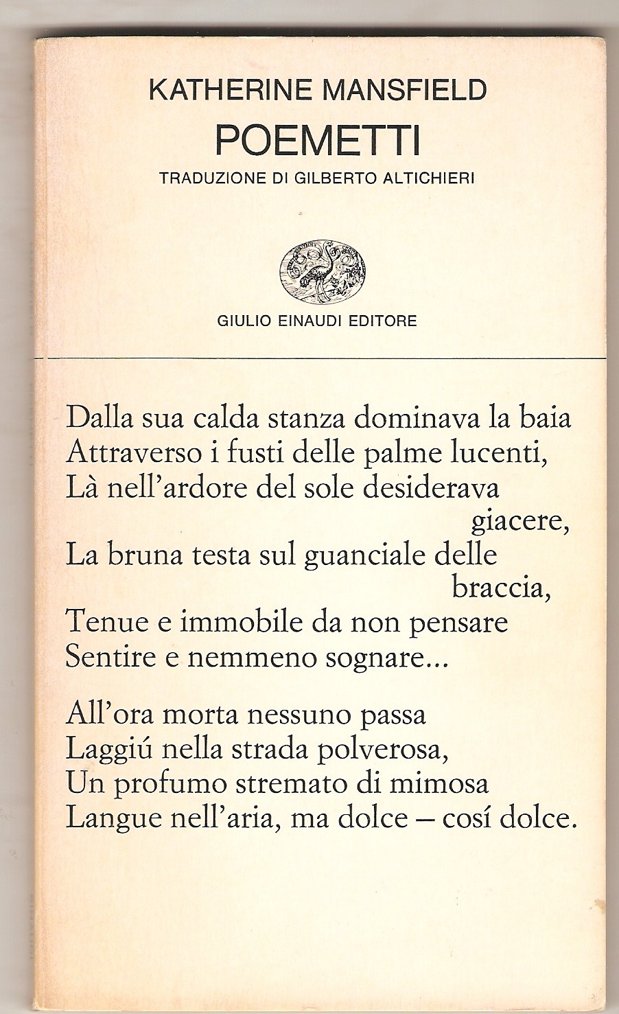 In questi Poemetti di Katherine Mansield troviamo anche i ricordi della lussurreggiante Nuova Zelanda, il suo amore per l’Amore, le sue immagini più colorate, la sua forza di veleggiare ad ogni costo verso la Felicità .