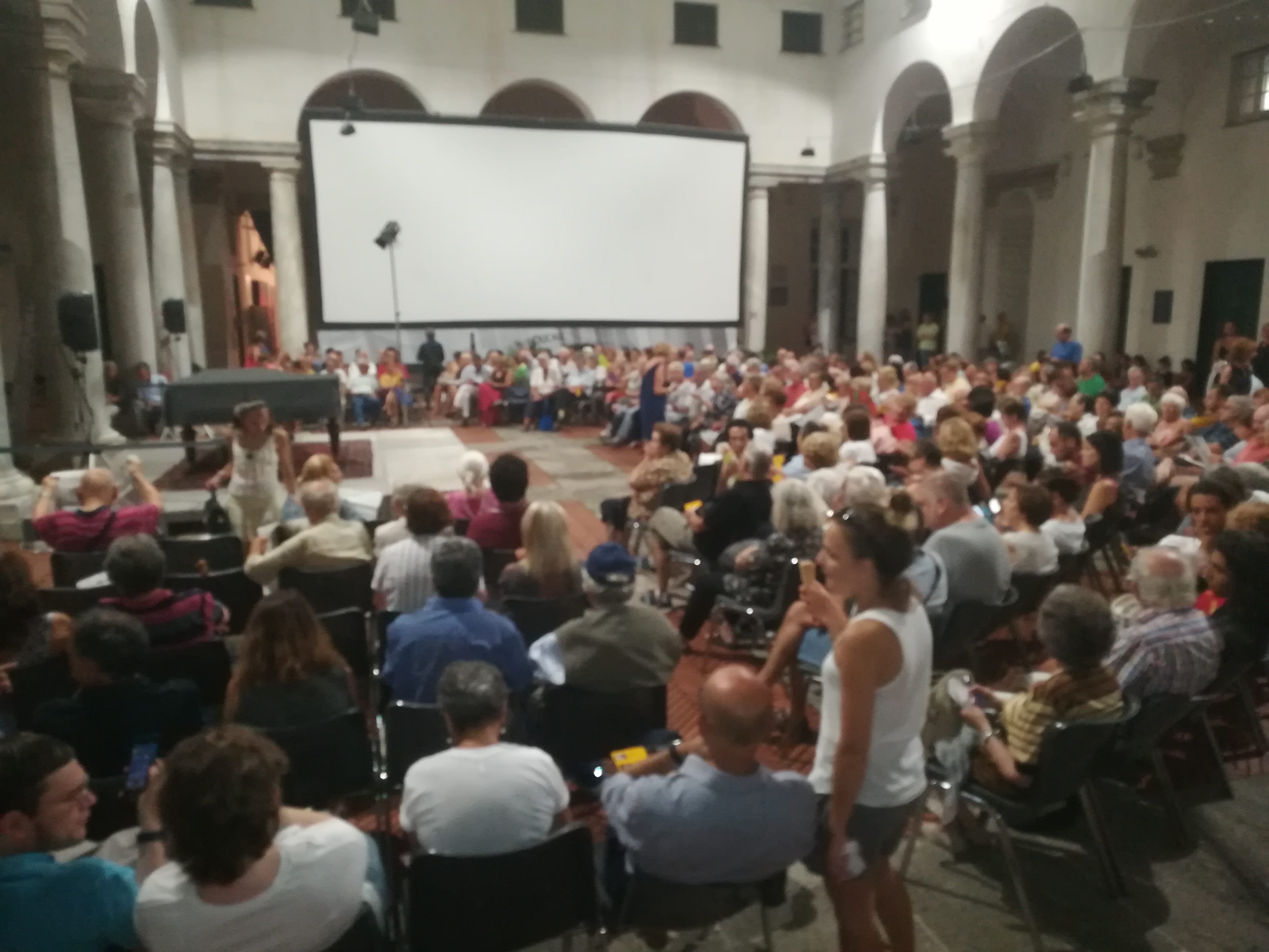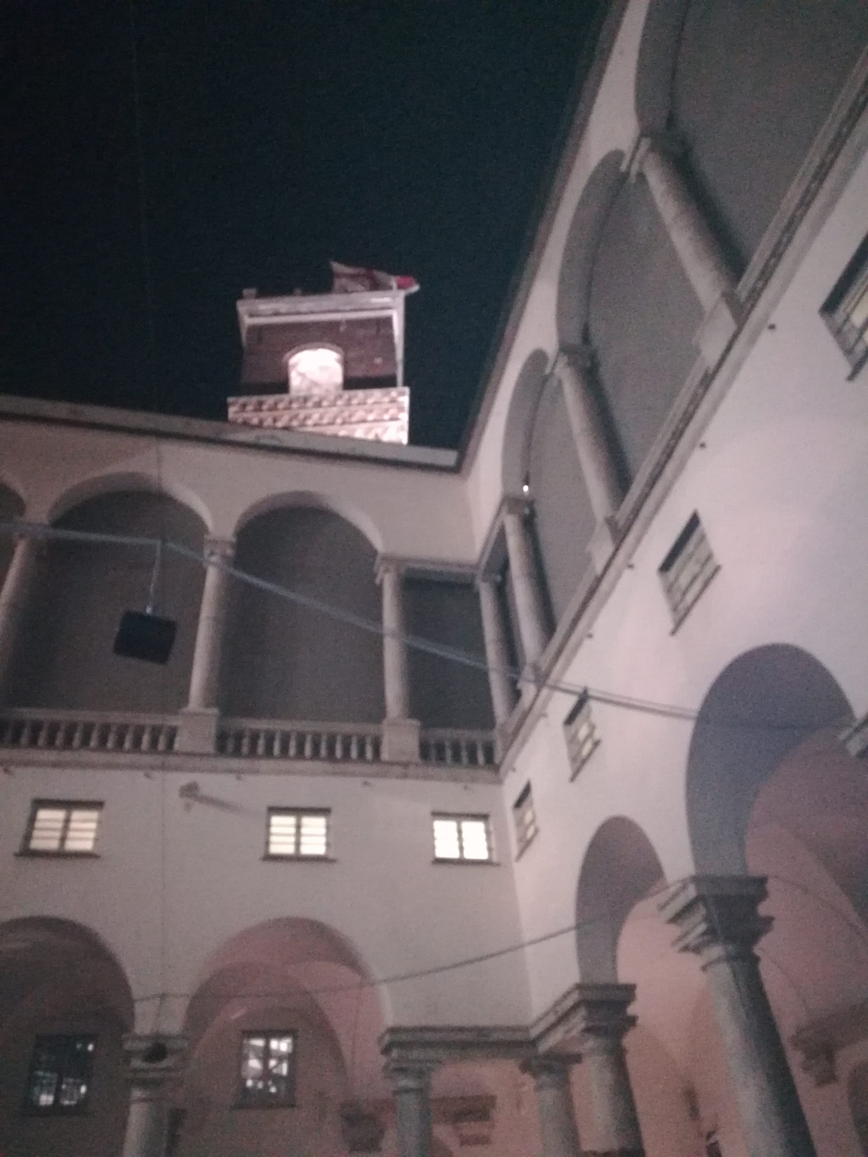 Le previsioni del tempo davano un temporalone alle 23,00 e noi tutti ogni tanto ad inseguire con lo sguardo le note che salivano in altro, verso quelle nuvole e invece no: il vento dell’armonia ha richiamato un altro vento, quello da nord ovest, che ha spinto il temporale verso il mare salvando il concerto. Qui a fianco, la bandiera sulla torre del palazzo che io da velista qual sono studiavo per capire come girasse il vento.
