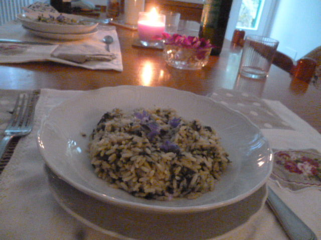 Ma non solo.Vogliamo parlare delle nostre cene del sabato sera? Questa volta ho finito in bellezza con il mio risotto alle borragine e fiori azzurri, e con le pesche al cioccolato e amaretti al forno.