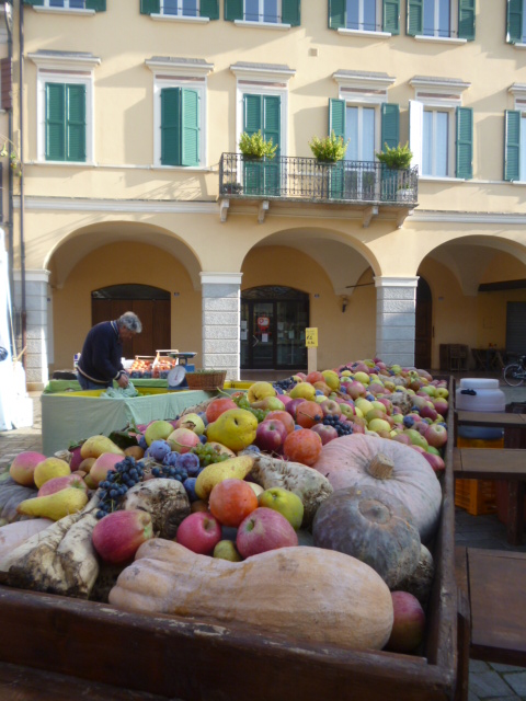 Carpi in una giornata calda e dorata di fine ottobre quando i colori della Cattedrale, del Castello rinascimentale, dei portici si accendono e si mescolano con quelli della frutta autunnale, funghi, cappelletti, leccornie  e antichi sapori propri della mia cittadina come i ciccioli, al savor, la saba… Tutti in opulente spettacolo al mercato.