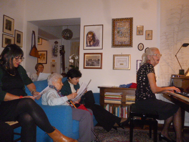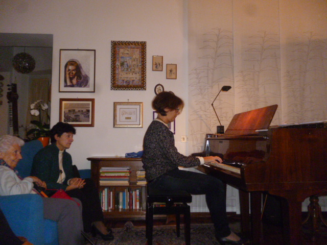 Ieri sera, dunque, lei ci suona due evocativi pezzi moderni, poi chiede a Stefania di suonare l’Arabesque di Shumann, poi si recitano  poesie serie, poesie in dialetto,  io e Maria Teresa (le mitiche twin sisters)  cantiamo La canzon degli angioletti che si scordano di fare la …pipì.
