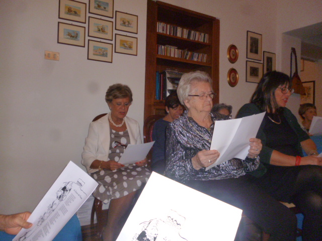 Carla ha finito il suo libro che Santo ha letto ed elogiato. Alfonso Masi ci parla dei suoi recital, dalla lettura di Garcia Lorca a Lutero. Poi ci sono i Lucatti, Enza, Daria, Lucia, Annamaria ed io, la solita coordinatrice e blogger.