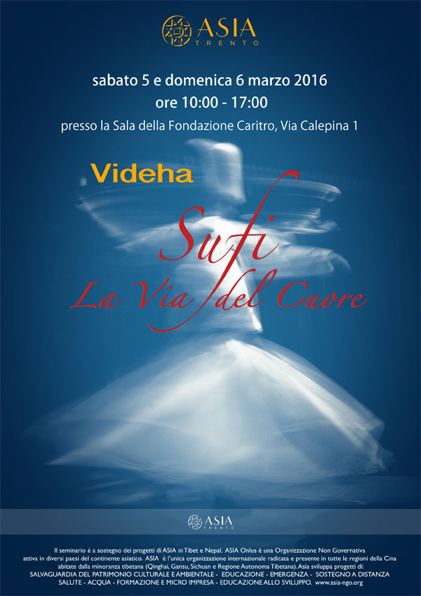Grazie alla presenza e guida di Videha, maestro Sufi, potremo fare un’esperienza di meditazione dinamica molto particolare.Sufi è una via mistica, è l’essenza che è al cuore di ogni spirito religioso. E’ l’antica saggezza del cuore e la via dell’amore nata da tale saggezza. Negli incontri di meditazione utilizzeremo diversi metodi quali il ritmo, la musica, la danza, la voce, il suono e la poesia per entrare in uno stato di vacuità . La danza roteante rappresenta e simboleggia l‘unità dell’uomo con il cosmo, un movimento nel quale