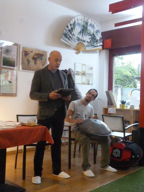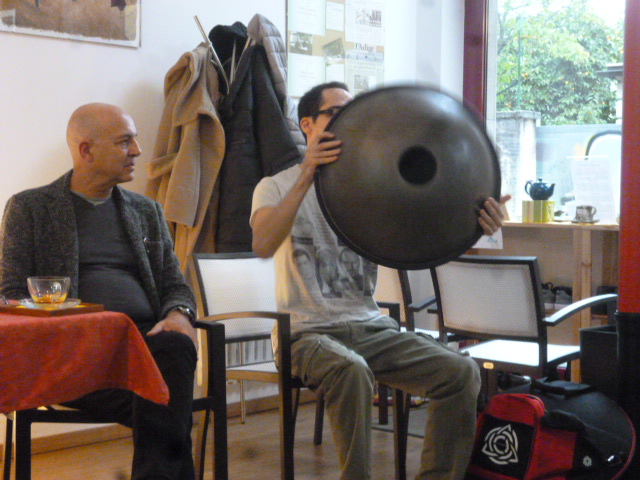 Mentre  Paolo Sceusa legge,  Alessio suona l’Handpan, un nuovo strumento d’acciaio,  progettato e assemblato in Svizzera. Il suono è argentino ed evocativo e si affianca  con armonia alle parole dense del libro.