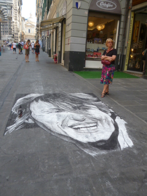 che vedremo poi alla Mostra. Colori pastello del palazzo  San Giorgio, chiaro-scuro delle pietre di San Lorenzo e dei Portici, il verde mare della fontana di piazza de Ferrari. Un’atmosfera che sa di Oriente, come punto di partenza per un lontano altrove un po’ onirico.  Caldo venticello che ci porta l’odore e i fremiti marini. A Genova si sale o si scende sempre, talvolta anche impercettibilmente. E ciò dà una sensazione di delizioso ondeggiamento.