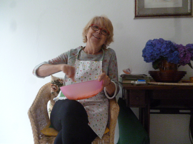 Le sue fronde fanno ombra a Francesco che aggiusta il tetto del casotto degli attrezzi…ed ecco a proposito dei cambiamenti della mia vita sociale: a fine giornata ci beviamo insieme sulla terrazza un bicchiere di vino bianco frizzante conversando con il vicino che ci parla del suo basilico greco odorosissimo – anzi ce lo fa accarezzare affinchè il suo profumo rimanga sulle nostre mani -delle acciughe fritte (con espressione estasiata) del minestrone e del tempo ovviamente. Il tutto scandito dalle campane che alle 20.00 preciso suonano l’inno a Maria.