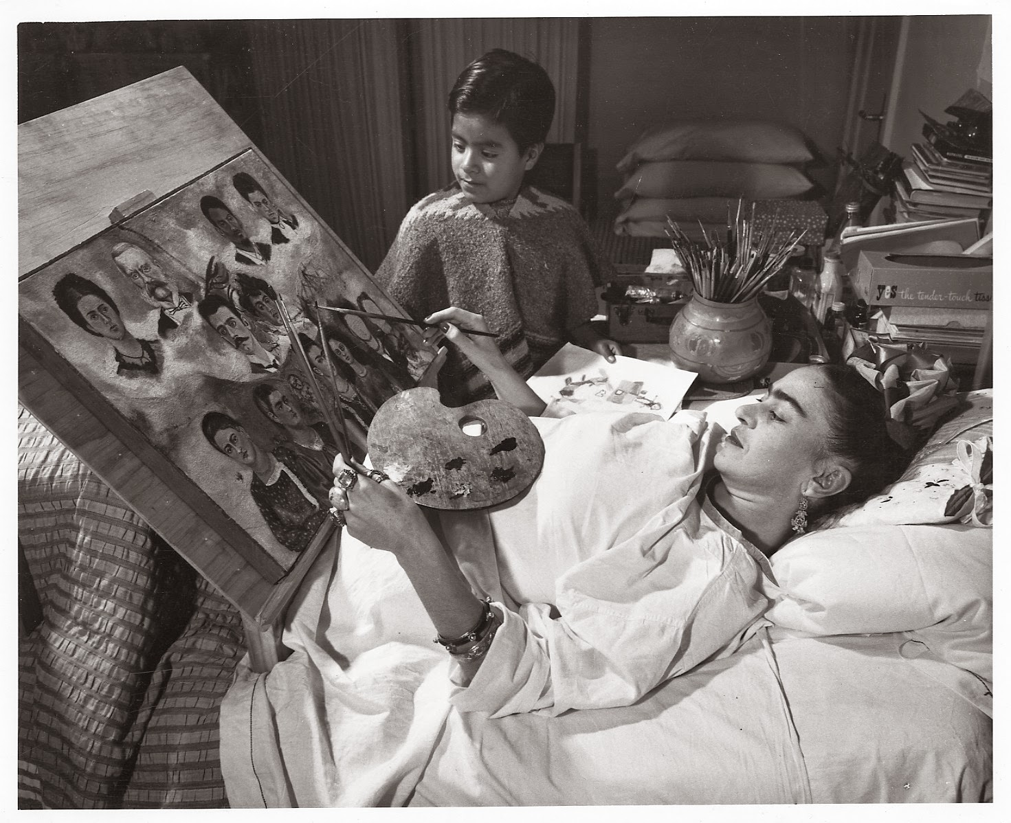 Importante durante la lettura delle sue biografie  guardare i suoi autoritratti eccezionali dove lei vestita spesso da contadina tehuana (come piaceva al Maestro) ci fissa con lo sguardo intriso di morte e consapevolezza. Tutto ci viene raccontato attraverso i suoi dipinti: dei suoi aborti, del suo desiderio sfrenato di maternità tanto che alla fine si ripiegherà come una madre sul suo Diego imprendibile come marito, ma accondiscendente nel farsi amare come un