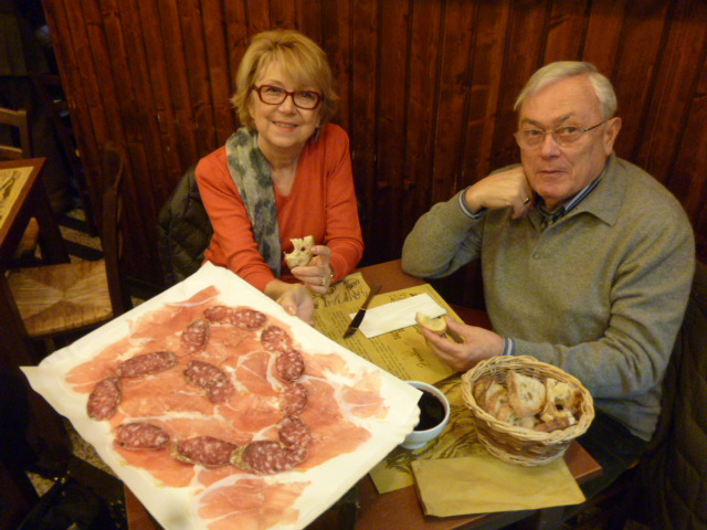 quasi sessant’anni. Milano da bere nella caffetteria di Palazzo reale e da…mangiare in una simpatica Salsamenteria di Parma, in via San Pietro all’Orto . Prosciutto e salame con varie salsine e lambrusco speciale bevuto in tazze, sotto lo sguardo severo  di Giuseppe Verdi e di tanti rosei prosciutti appesi.
