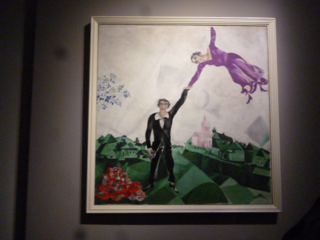 con fiori bianchi o vestita di nero o lilla  , ma sempre trattenuta con amore dal marito per non lasciarla andare. Così Maristella ed io ci aggiriamo estasiate tra colori forti del villaggio russo mai dimenticato da Chagall, fra paesaggi di neve o