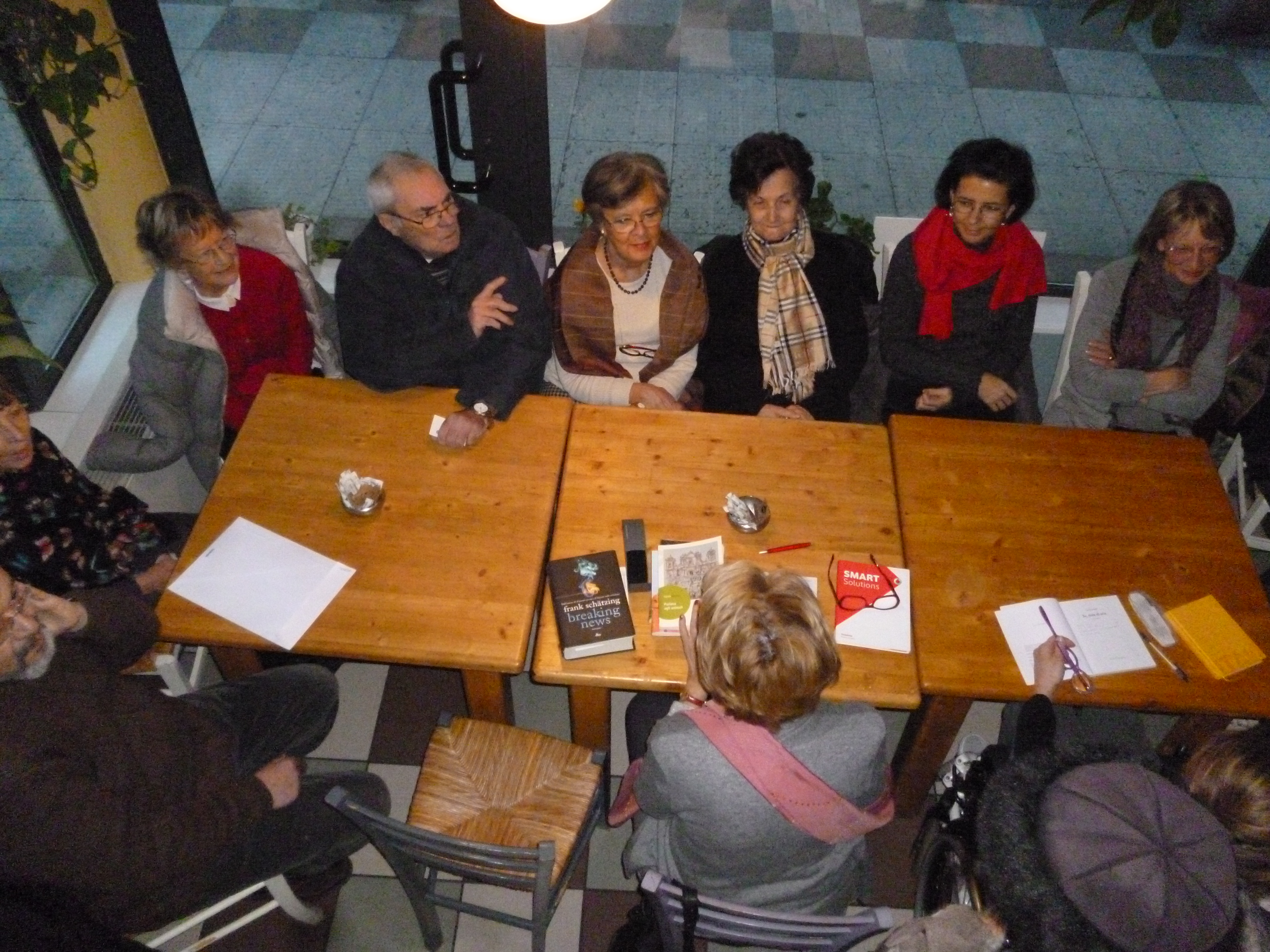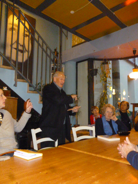 Mi sento di nuovo a scuola, ma è così diverso e divertente aiutare tutti a  sentirsi proprio agio!  Ho “interrogato” Enrico  il giovane nipote di Maria Teresa e Riccardo che simpaticamente si è alzato in piedi per raccontarci i romanzi di Mauro Corona  quali “Storia di neve” aggiungendo  la sua positiva  impressione dell’autore: un personaggio originale e alla mano, ma efficace, chiaro, immaginifico.  Anche Giovanni si infervora parlando di “Nel legno e nella pietra” e non dimentichiamo certamente “Vajont, quelli del dopo”.  Devo leggere anch’io i libri di questo scrittore, scultore e  scalatore che vive in Trentino.