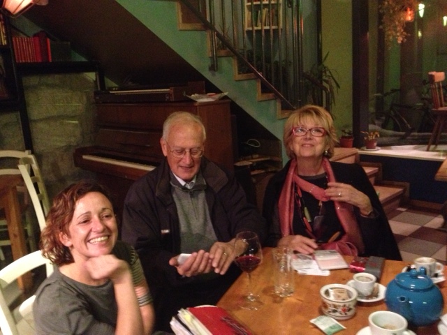 nostro nuovo punto d’incontro per parlare di libri e altro. Grazie a Ferruccio che ci ha suggerito questo luogo ci siamo ritrovati sentendoci  immediatamente avvolti dall’atmosfera colorata, calda, giovane, eletrizzante di questo angolo che mi ricorda Parigi. Sì, noi “giovani” nel cuore e nella mente abbiamo assorbito l’euforia energizzante di Francesca Quadrelli  che ci ha spiegato le molteplici attività di quasto Cafè lab aperto alla creatività , all’arte, allo stare insieme in modo un po’ alternativo. Un altrove vicino perchè lo spazio del pensiero che incontra, assimila, recepisce, “legge” e poi  condivide, è sicuramente parte del “viaggio” che deve sempre proseguire in noi.