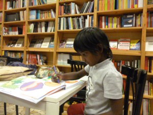 E mentre Maria Grazia continua parlandoci di Sandor Marai e del suo romanzo “La sorella”, io osservo con la coda dell’occhio Saraswati che in un tavolino accanto al nostro disegna e colora prestando sicuramente l’orecchio alle nostre voci e al nostro parlar di libri.