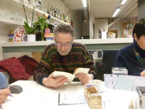 Quando con nostra grande gioia arriva anche Giovanni Soncini lo mettiamo a capo”tavolino” e gli diciamo che stiamo parlando di poesia. Lui è un fisico, legge soprattutto saggi e storia, ma prende in mano “Sopra le nuvole” e comincia a