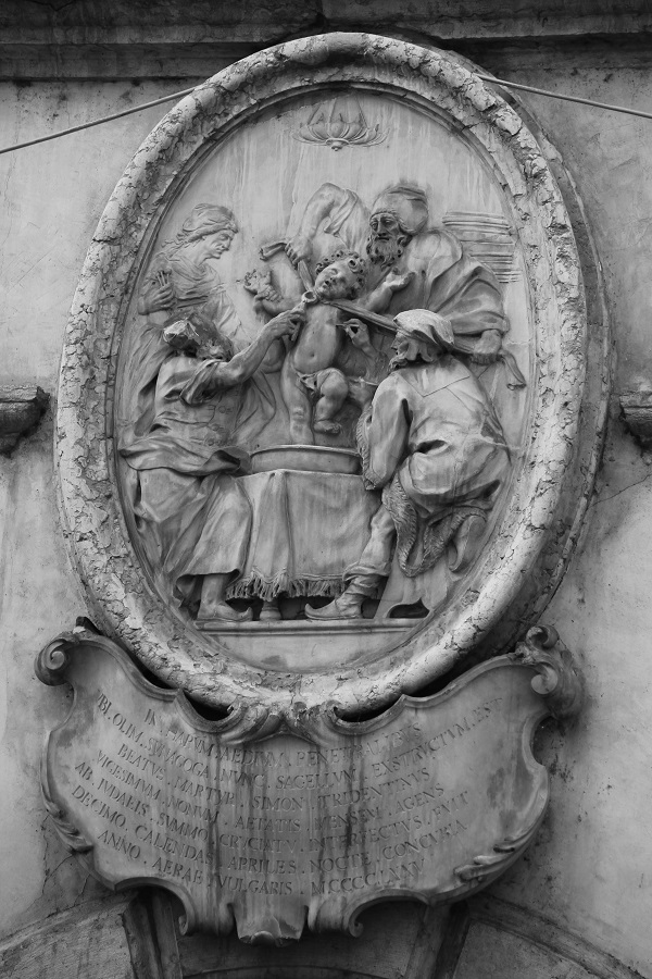 I fatti – riassunti efficacemente nella voce dedicata al Simonino su Wikipedia – ricostruibili attraverso gli atti del processo istruito contro la locale comunitA� ebraica, andarono in questo modo. Un bambino di due anni e mezzo scomparve la sera del 23 marzo 1475, GiovedA� santo, e fu ritrovato cadavere la domenica di Pasqua, nelle acque di una roggia, proprio vicino all’unica casa abitata dai quindici ebrei residenti a Trento, nella zona dell’attuale piazza della Mostra. In un clima di diffuso antisemitismo, infuocato dalle predicazioni del frate francescano Bernardino da Feltre, il principe-vescovo Giovanni Hinderbach sostenne con forza la tesi che il bimbo era stato vittima di un “omicidio rituale” perpetrato dalla locale comunitA� ebraica (finalizzato alla raccolta del sangue di un bambino da utilizzare per impastare il pane azzimo per la Pasqua ebraica).