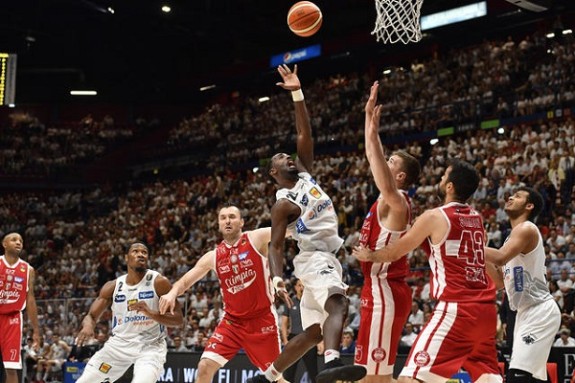 Che cuore. Che difesa. Che squadra. Nonostante un inizio di match offensivamente balbettante, che l’aveva vista precipitare sul meno 11 giA� dopo sei minuti di gioco, la Dolomiti Energia si aggrappa alla sua clamorosa difesa per non affondare sotto i colpi dei campioni d’Italia in carica, e sbanca il Forum in Gara 1 della Semifinale Scudetto, battendo l’EA7 Milano per 66-76 al termine di una partita memorabile. A trascinare i trentini al successo un Dustin Hogue semplicemente mostruoso (23 punti, 7 rimbalzi e 31 di valutazione) e le solidissime prove di Shavon Shields (12 punti e 5 recuperi) e Diego Flaccadori (10 punti e 4 assist), anche se risulta difficile raccontare il terzo successo della storia aquilotta al Forum senza parlare delle tre triple di Beto nel secondo quarto, e dell’indescrivibile sforzo collettivo di cui tutti gli uomini di Buscaglia sono stati capaci sui due lati del campo per 40 minuti filati.