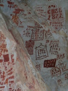Tra i segni piA? frequenti, le iniziali del nome e cognome, l’indicazione dell’anno, il conteggio del bestiame portato al pascolo, a volte racchiusi da cornici e accompagnati da messaggi di saluto, annotazioni diaristiche, simboli religiosi o disegni con figure di animali, scene di caccia, ritratti, autoritratti e cosA� via. Scritte che restano a tutta��oggi indelebili e incredibilmente chiare sulle falesie calcaree della valle – a dispetto di tre secoli di intemperie – grazie anche al pigmento usato, un’ocra rossa localmente chiamata bA?l , mescolata con latte di capra o saliva e stesa sulla roccia con la��ausilio di un rametto.