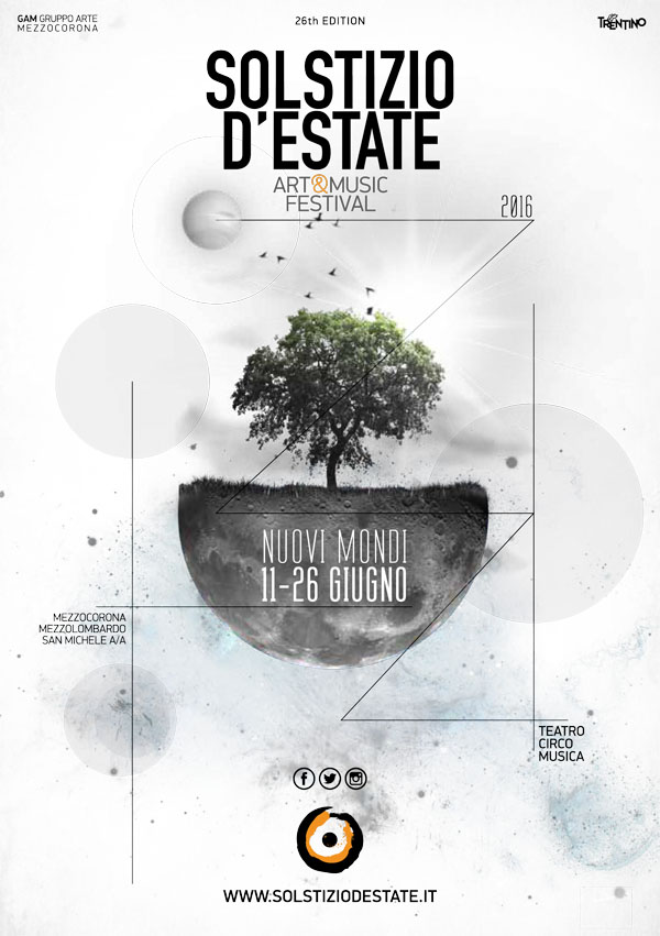 Ancora una volta il Festival porterA� nelle corti e nei teatri della Rotaliana artisti di altissimo livello, della scena nazionale ed europea. Solstizio da��Estate 2016 con un quarto di secolo di storia alle spalle, proporrA� nel 2016 una stagione ricca di novitA�, costruita attorno al tema cardine “Nuovi Mondi”. Come da tradizione il festival sarA� itinerante, e poliedrico: circo, musica, teatro di parola e contemporaneo si alterneranno in sei appuntamenti, per un totale di 8 artisti, fra musicisti, attori ed acrobati. Andranno in scena fra gli altri la compagnia Scimone Sframeli, Lucilla Giagnoni,A� il duo di circo belga Okidok, l’ultimo spettacolo dei Quotidiana.com,A� la musica multietnica del Quintetto Turchese, quella trentissima del Curly Frog and the BluesBringers, fino al gran finale con I Tre Allegri Ragazzi Morti ed Emanuele Lapiana. La rassegna quest’anno sarA� arricchita anche da due laboratori, un “LaBollatorio” di bolle di sapone ed un workshop di critica teatrale, e da una serata in piazza dedicata alla popolazione che inaugurerA� il festival.A� Si parlerA� di societA�,religione, di scoperte ed esperimenti, di dibattiti attuali e multiculturalitA�, con spettacoli inediti nei confini trentini e tre compagnie alla loro prima apparizione in regione. Ancora uno volta, Solstizio A? un festival che esiste solo grazie ai suoi volontari.
