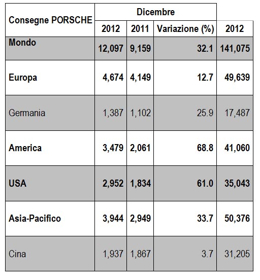 Nel 2012, Porsche ha goduto di indici di crescita a doppia cifra in tutte le regioni di vendita. La regione Asia/Pacifico A? in cima alla lista con 50.376 unitA� consegnate (+23,6% rispetto all’anno precedente), seguita dalla��Europa, dove il costruttore di vetture sportive di Stoccarda ha venduto 49.639 nuove vetture (+13,5%).