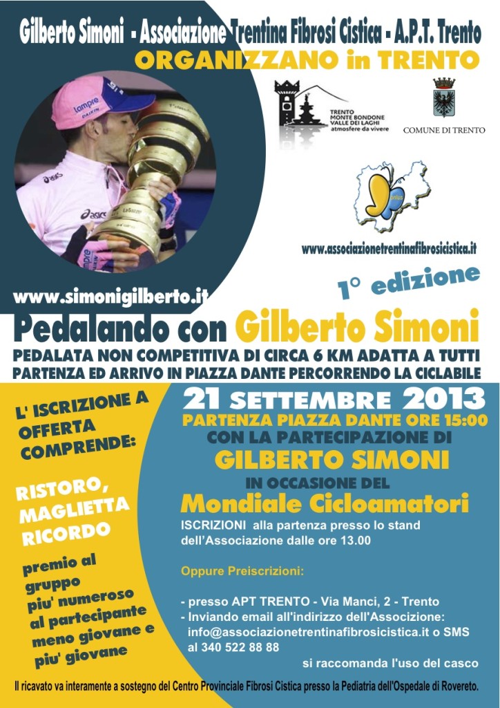 Partenza e arrivo Piazza Dante percorrendo la ciclabile lungo l’Adige – l’iscrizione, ad offerta, comprende maglietta ricordo e ristoro – Evento organizzato dall’Associazione Trentina Fibrosi Cistica Onlus e Gilberto Simoni a sostegno del Centro Provinciale Fibrosi Cistica Trentino presso la Pediatria dell’Ospedale di Rovereto, dove vengono seguiti i pazienti trentini.