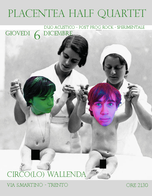 Placenta Half QuartetQuesta sera, 7 dicembre – ore 21.30, ospiti del Circolo Wallenda di via San Martino a Trento, saranno i P.H.Q. (Placentea Half Quartet) – L’Half Quartet, duo neo-prog rock nato dall’incrocio sonoro del pachiderma progressive classe 1970 con i più recenti dis-sapori fine ’80, tra i quali Sonic Youth. Il duo è composto dai fratelli Alvise e Pier Paolo, che oltre alla passione per il suono puro condividono anche quella per l’anatomia comparata e l’embriologia (da qui lo stravagante nome del gruppo).