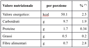 Dove possibile, i dati sono riferiti alle tabelle di Composizione degli Alimenti della��Istituto Nazionale di Ricerca per gli Alimenti e la Nutrizione.(*) % delle quantitA� giornaliere indicative di un adulto, calcolato sulla base di un fabbisogno giornaliero di 2000kcal; il fabbisogno puA? essere diverso a seconda del sesso, della��etA� e della��attivitA� fisica svolta.