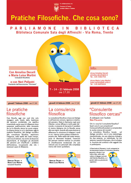 Annalisa Decarli, Maria Luisa Martini (consulenti filosofiche) e Neri Pollastri (Presidente Associazione “Phronesis”) in collaborazione con il Servizio Cultura e Turismo del Comune di Trento organizzano tre interessanti appuntamenti alla Bibloteca di trento per capire e approfondire il significato del “fare filosofia” oggi.