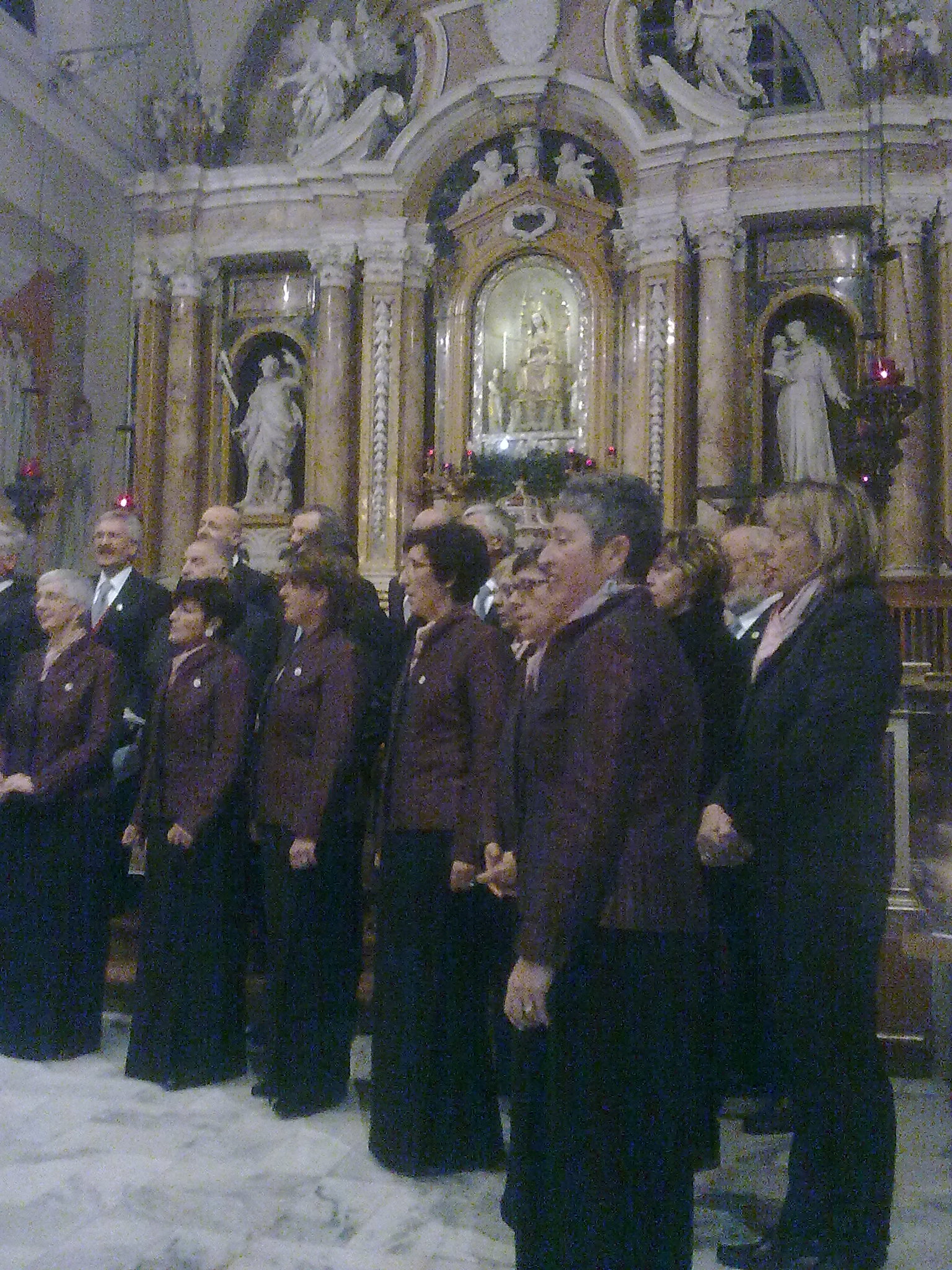 Avvento. Il Santuario è sempre molto frequentato, sarà sicuramente per la devozione alla Madonna, e poi per la simpatia dei Frati Francescani, forse anche un po’ per l’ampio posteggio, motivi spirituali e laici concorrono a richiamare i fedeli. Oggi, un regalo. Durante la Messa (ma soprattutto dopo) un coro, il “Coro Amicizia Volano†di Volano, appunto, un paese della sinistra Adige, poco a nord di Rovereto, ha regalato a tutti noi momenti di elevazione spirituale e musicale. Non ero preparato per una recensione. Qualche foto con il telefonino e niente di più. Ma ho sentito il bisogno – anche per questa via – di ringraziare il Direttore del Coro, Maestro Tarcisio Tovazzi (Direttore operativo alla pianola) tutti i coristi e i Frati di questo grande regalo che ci hanno offerto.