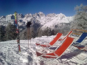 Ebbene sì, rieccomi a sciare in Paganella, dove sennò? Il Bondone e la Paganella, le due montagne di Trento. Mezz’ora in auto e sei a Fai. Tre seggiovie a fila e sei in vetta, oltre 2200 metri. Un’ora da casa. Cosa chiedere di più? Chi abita a Milano impiega questo tempo solo per andare a farsi un ‘ora di tennis! Evviva il Trentino! Evviva Trento: per noi, andare a sciare è come andare al cinema o a teatro: qualche ora e poi a casa. Ogni tanto, impegni vari permettendo ( e son o tanti anche per un pensionato, giovane nonno, credetemi!), ci si ferma l’intera giornata.
