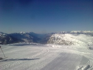 Ieri notte è nevicato. Fine della perturbazione, fronte freddo, vento da nord. Alle 08,10 ero alla partenza della telecabina ad Andalo, ad aspettare che nelle prime cabine caricassero i rifornenti per i vari rifugi. Al loro “Via!, via di corsa, a guadagnarsi la prima cabina disponibile. Perché? Perché il primo che arriva in cima si fa una discesa in neve fresca e vergine. Ecco perchè! Già salendo si pregusta … la nevicata è stata lieve, diciamo quindici centimetri (ma l’altro giorno sono stati 50!) quindi non hanno fatto uscire i “gatti†a battere le piste: ottimo! Dopo la telecabina, un breve tratto e poi la seggiovia che ti porta ai 2200 metri di Cima Paganella. Sulla destra, la pista intonsa. Sulla vetta si intravedono sbuffi di neve, sollevata dagli ultimi colpi di coda del fronte freddo. E poi, il Lago di Garda! La visibilità è ottima. Si arrivano a distinguere gli Appennini che chiudono da sud la Val Padana! Portarmi appresso la macchina forografica … no … mi ingombra. E il mio telefonino è un po’ all’ “anticaâ€, le foto le fa, ve le allego, ma non sono un gran che stante l’ottica limitata dell’apparato, “contentetene†(accontentiamocene, in dialetto trentino).