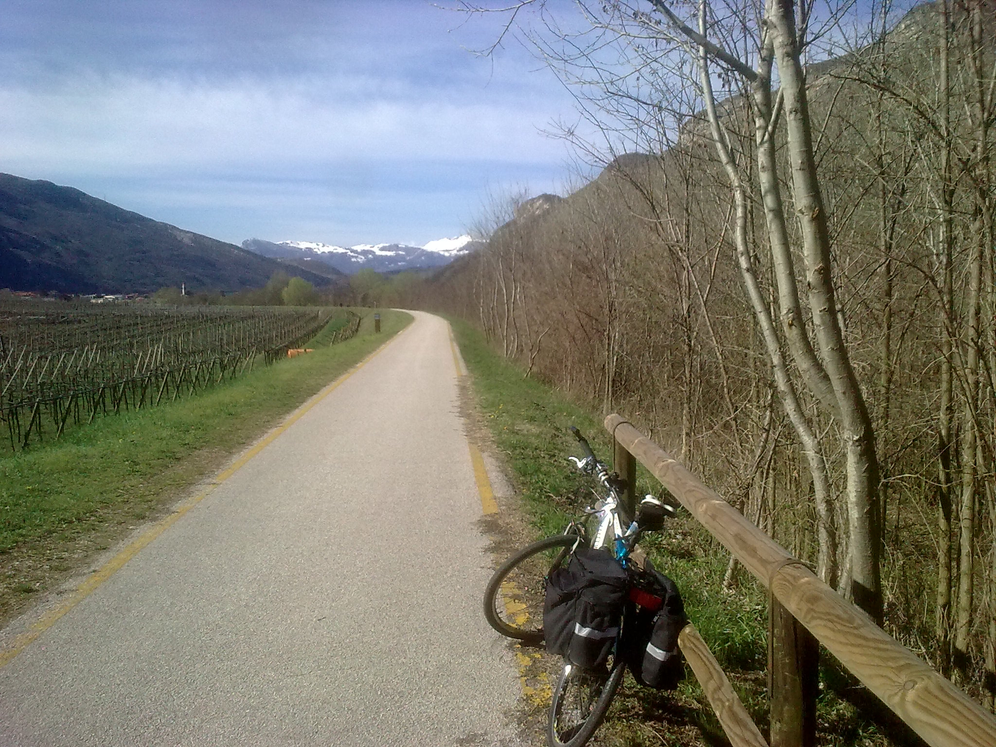 Da Trento a Riva del Garda, con alcune piccole deviazioni. 52,5 km. Ho usato la mtb perchè mi sono portato appresso due borse con indumenti di ricambio, per eventualmente indossarli “a cipollaâ€, non sapendo come sarebbe stata la temperatura. Sulla mtb ho montato i pneumatici lisci, non dovendo affrontare sterrati. Prima di Nomi mi fermo per fotografare la ciclabile con lo sfondo della neve della stazione sciistica de La Polsa-San Valentino. Ho la macchina fotografica … senza le pile! Bravo mona, si dice qui da noi! E così utilizzo il mio vecchio telefonino. Pazienza …