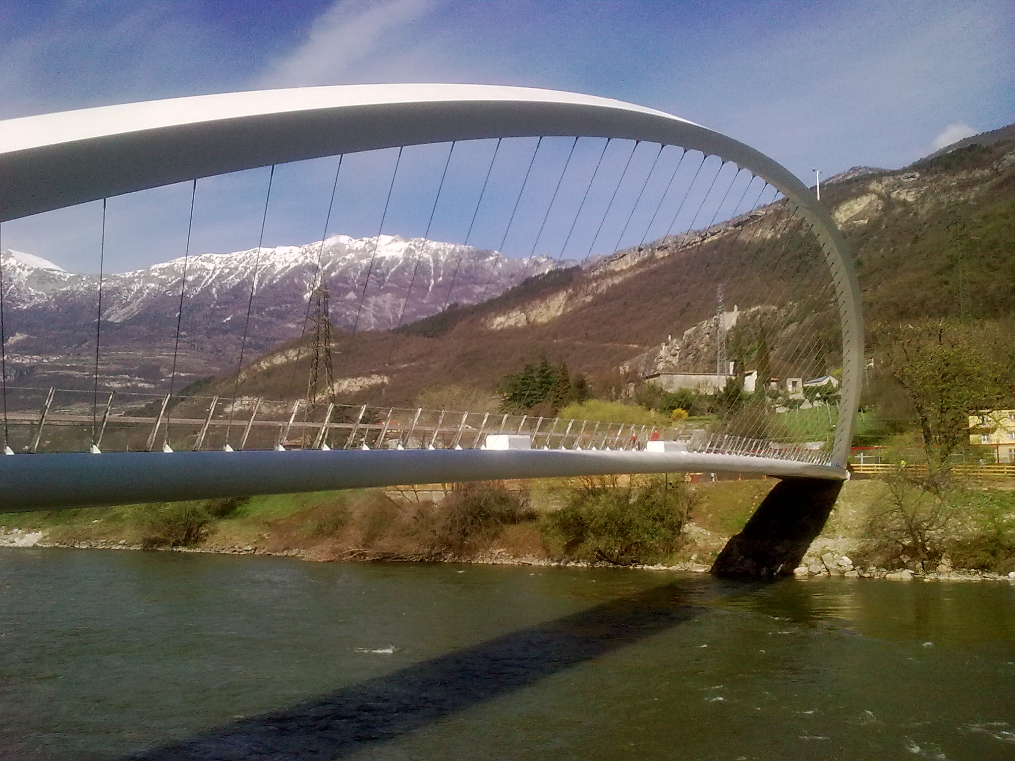 Prima sorpresa: a Nomi, il nuovo, bellissimo ponte ciclabile. Così bello da far dimenticare che non è opera della natura ma dell’uomo. Complimenti al progettista! A Rovereto Borgo Sacco sosta alla bella fontana per fare il pieno d’acqua. indi ancora verso sud e dopo la diga della centrale idroelettrica, si “gira a destra (ovest).