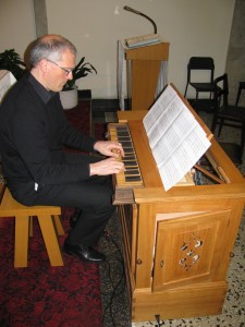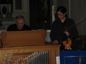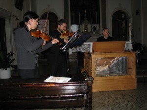 Musica viva, che scaturiva da secoli passati, e rimbalzando di secolo in secolo, giungeva a noi ascoltatori come se noi stessi fossimo riportati indietro nel tempo. Sonorità diverse, quelle dei violini, che si sdraiavano nel letto delle note dei violoncelli, all’ombra del venticello, ora più sbarazzino, ora più carezzevole dell’organo. L’organo, simpatica l’esecuzione di un brano che ha richiesto l’accompagnamento di un “volta pagina†particolare, ad azionare i vari registri, il che ha aggiunto un pizzico di allegria scaturente dalle occhiate d’intesa fra l’organista e la sua aiutante di campo Andrea.