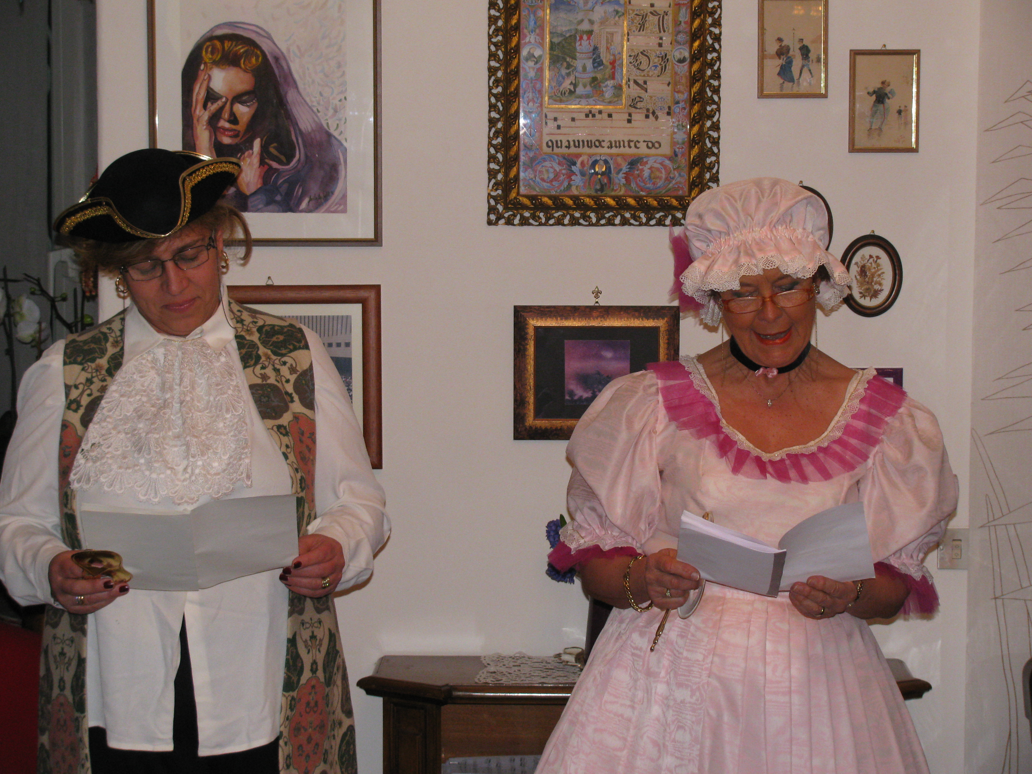 In coda alla relazione, è seguita la rappresentazione di alcuni brevi scene dalla commedia Il ventaglio.. La trama? E’ complicata … la trovate fra i libri di casa vostra o in Internet. Vi dico solo che “tra i personaggi troviamo le tipiche figure femminili goldoniane ben delineate, il tipico nobile che vanta la sua origine ma è senza un soldo, la simpatia dell’Autore per i popolani operosi e anche un pizzico di autobiografia nel finale”.