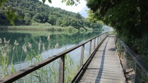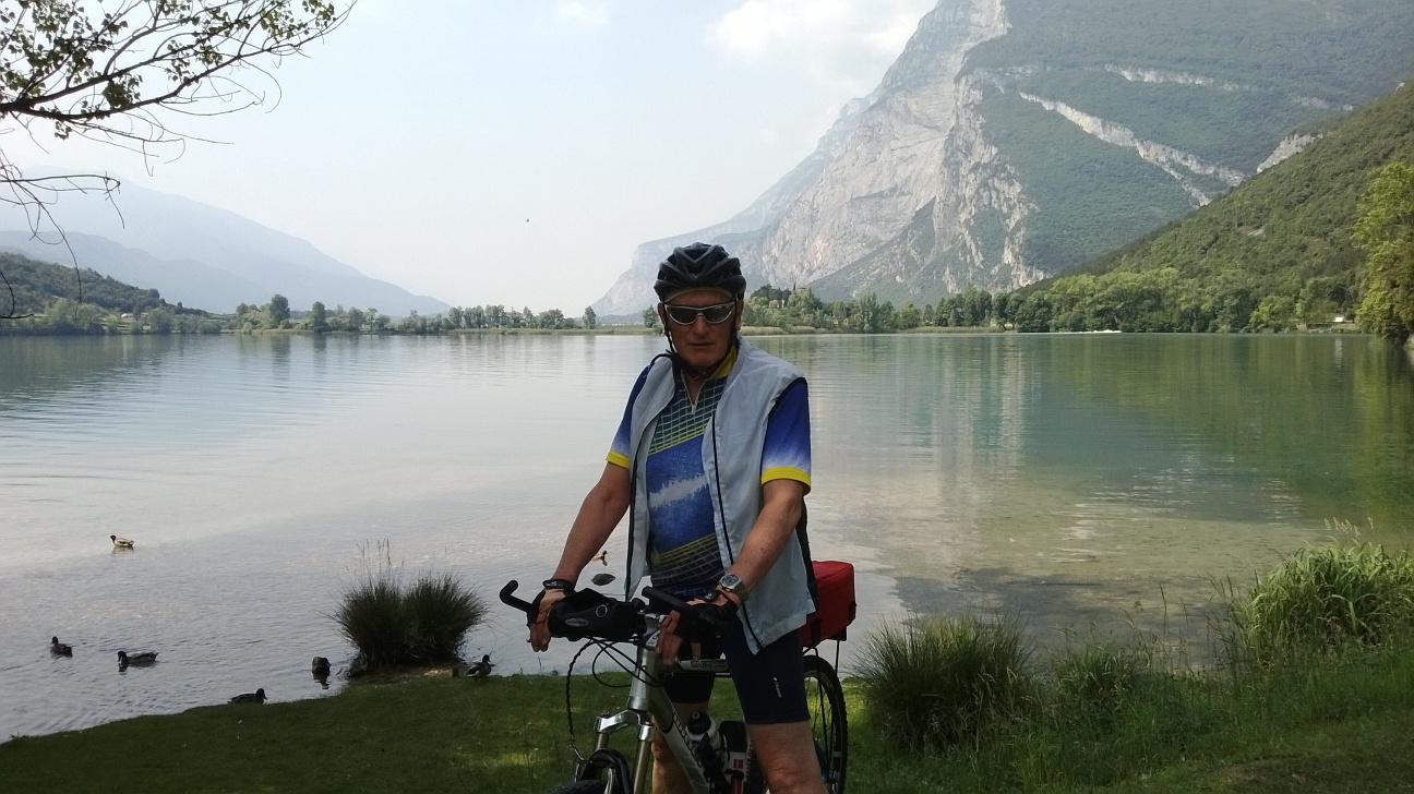 Arrivo alla piccola rotatoria che preavvisa l’inizio del Lago Toblino. Con cautela traverso la strada e mi immetto sul sentiero sterrato- passerella di legno che prima conduce e poi costeggia il lago. Bellissimo. Alla fine, un po’ di marciapiede mi conduce a Sarche. Non entro in paese, una strada a sinistra funge da circonvallazione, verso il cimitero (alti cipressi). Indi verso sud. Qualche piccolo saliscendi, il Sarca, il Lago di Cavedine. Un saluto al mio amico Andrea Danielli, titolare del locale centro velico, un caffè. Torno 3 km verso nord, a sinistra sulla passerella sul fiume, bretella sul fiume, indi  periferia di Pietramurata. Ancòra verso sud, ciclabile ora tutta asfaltata (novità di quest’anno), un tratto in discesa al 20%, verso la Centrale di Fies e Drò.