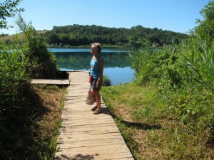 Qualche ciclista (che invidio). Si arriva al lago. Si tratta di un lago alimentato da una sorgente, con acqua a temperatura costante, estate e inverno (20 gradi). 15 ettari di estensione, circondato da una corona di canne ben protetta. L’accesso all’acqua è consentito da alcune passerelle in legno poste a circa 150 metri una dall’altra, che attraversano il “mare” di canne. Unico emissario, il Bruna, che poi va a sfociare a Castiglione della Pescaia. Il più grande bacino di acqua dolce del grossetano, già utilizzato dagli Etruschi. Intorno, colline coltivate, due ex poderi ora ville (di lusso). Silenzio, tanto. Visitatori: pochi, due auto tedesche e noi. Un vero lusso!