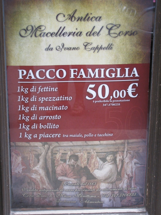 E poi, sempre a Massa Marittima, ci ha colpito il negozio di un macellaio, con il suo “pacco famiglia”