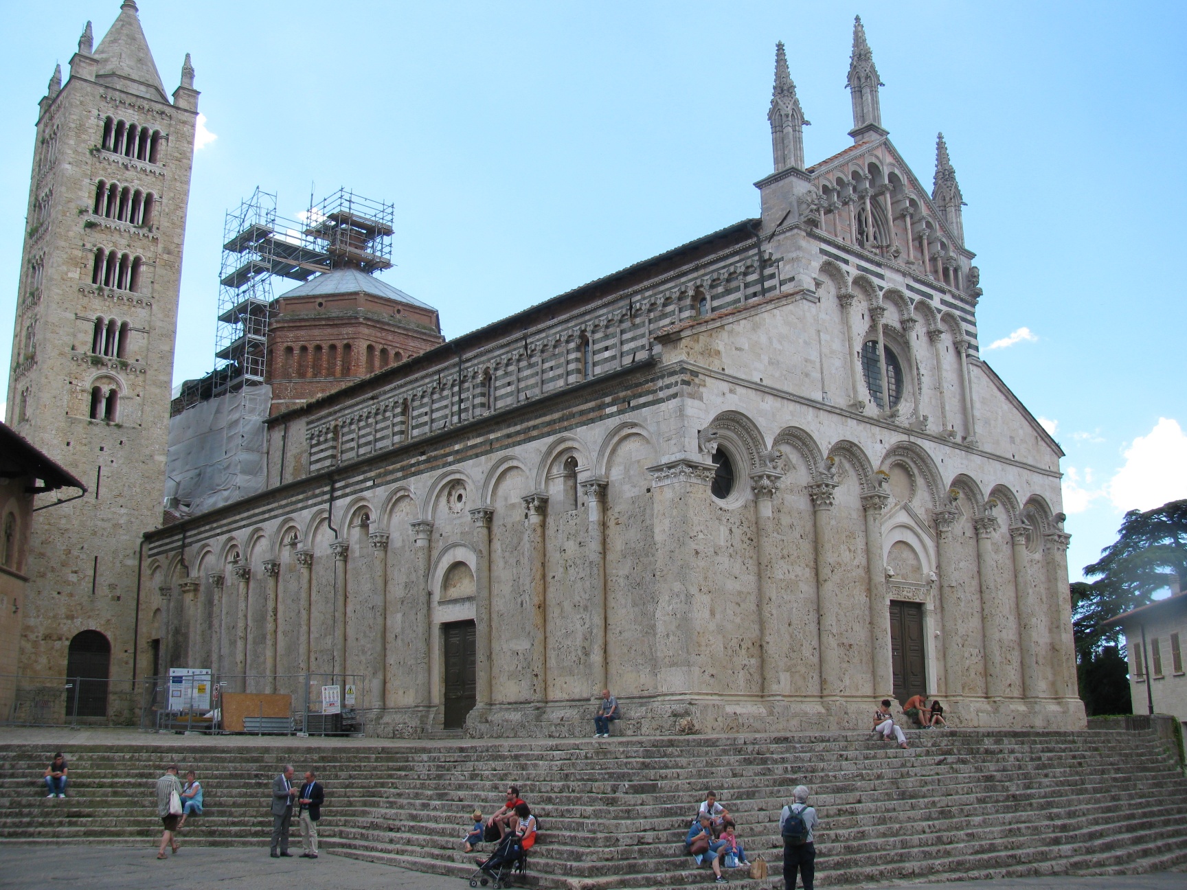 Dal lago, proseguiamo fino a Massa Marittima, che poi marittima non è in quanto collocata su un cocuzzolo. Cittadina molto bella: il Cassero (castello) senese, la Chiesa di S. Agostino con relativo chiostro, una vista molto ampia sulla Maremma. La Piazza Principale, bellissima, con la Cattedrale (v. foto)  e tre palazzi medievali. Pranziamo in un ristorantino 100 metri dalla piazza ad un prezzo veramente modico: 10 euro a testa per antipasto, primo, contorno acqua e vino.