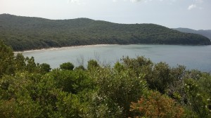 La strada d’accesso è ovviamente non asfaltata, percorsa solo dai mezzi della forestale, del pronto soccorso e dei VV.FF.. Corre alta sul mare, ombreggiata da lecci e querce, che a tratti si aprono per lasciarti vedere l’azzurro delle acque sottostanti. Di fronte, ben visibili, da sud a nord: Punta Ala, l’Elba, Piombino, Follonica.  Ce la siamo presa comoda (io sono arrivato a Puntone in bici, Maria Teresa in auto, poi entrambi a piedi), e siamo arrivati in spiaggia alle 11,00.