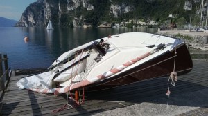 Ecco, qui nella foto a destra …. no, non è il mio Fun, è un’altra barca, più piccola, una deriva … sembrerebbe che avesse voluto planare con L’Ora in poppa sullo scivolo di legno della Fraglia … e invece no, state tranquilli, è di un qualche turista tedesco che l’ha depositata qui per armarla e farla scivolare in acqua. Certo che a prima vista fa un po’ impressione … Passavo di lì e non ho potuto fare a meno di scattare una foto …