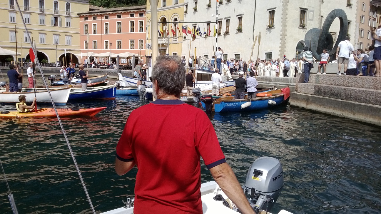 15 agosto, FESTA DELL’ASSUNZIONE. Passavo di lì, dicevo, ‘sta mattina, per preparare il mio Fun e andare a rendere omaggio alla Madonna portata in processione in occasione della Sua festa, con sosta al porticciolo vecchio di Riva del Garda (Porto Catena)  entro il quale noi “barcaroliâ€, velisti e non, Le abbiamo reso omaggio con l’alzata di remi al comando di “Onori alla Madonna!” Qui a sinistra, di spalle, un mio amico, Enrico, a bordo della sua “Birilloâ€.