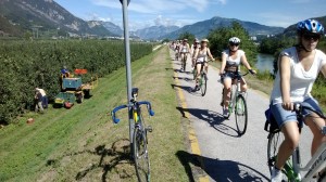 Ed ecco che mi è venuto spontaneo un collegamento: Il Trentino delle mele (oltre che di tante altre cose belle), il Trentino delle piste ciclabili … perchè non organizzare l’Offerta Trentina lungo le nostre ciclabili? Essa potrebbe riguardare innanzi tutto l’offerta delle stesse piste (magari venisse il collegamento dell’asta dell’Adige con la Valle dei Laghi e la Valsugana!) e poi l’offerta delle mele, dell’uva, del vino, dei castelli, delle località sciistiche, dei masi, delle chiese affrescate dai Baschenis, etc.. Quanto (poco) sarebbe costato all’APT offrire una mela a ciascuno di quei cento pedalatori tedeschi? Quanto bello sarebbe stato il ricordo della nostra Terra che ognuno di essi avrebbe portato con sè, tornando a casa! Concludo: e poi dicono che i Trentini sono musoni, un po’ chiusi in se stessi … Ma qua’ chiusi, per piacere … basta conoscerli, rispettarli e soprattutto riconoscere e mostrare di apprezzare il loro lavoro.