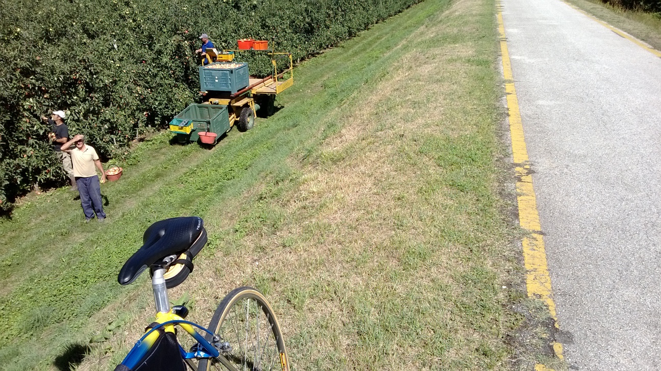 Caro diario, come sai io ho una bronchitina che ogni tanto mi dà qualche fastidio, ragion per cui in questi giorni mi stanno facendo ingoiare un po’ di antibiotici … con il divieto di affaticarmi. Una settimana? E chi ci sta fermo? E poi io in bici da Trento al bicigrill di Nomi e ritorno, giusto per gustarvi un caffè al sole,  mica mi affatico! Ed allora, in sella e via! Ma senti un po’ cosa mi è capitato. Stavo rientrando verso nord, sulla pista ciclabile destra Adige. Alla mia sinistra vedo alcune persone che, qualche metro più in basso, ai piedi della piccola scarpata del terrapieno sul quale corre la ciclabile, stanno raccogliendo le mele: campagna di Ravina? Di Aldeno? Non posso saperlo… Comunque la scena è troppo bella … mi fermo, torno sui miei … pedali, appoggio ad un palo la mia vecchia gloriosa bicicletta (28 anni assai ben portati) e mi metto a fotografare la scena. Nel frattempo mi sfila di fianco, diretta verso sud, una lunga, lunga comitiva di ciclisti tedeschi, saranno stati un centinaio. Li saluto e continuo con i miei scatti.