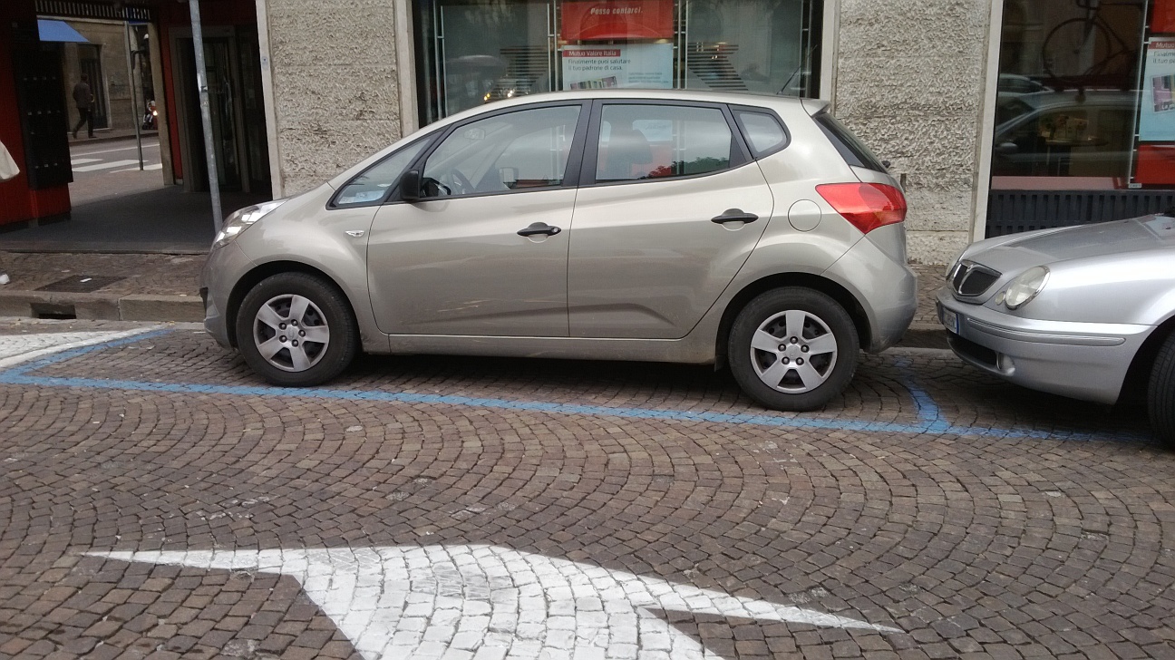 Stalli blu di sosta. Stallo di testa, cioè il primo. Davanti, spazio libero. Un’auto lo occupa, senza che il suo autista si preoccupi di utilizzare ragionevolmente lo spazio a sua disposizione sul davanti, che resta letteralmente sprecato, andando quindi a sacrificare il secondo stallo, nel quale poi mi sono sistemato io con una lunga, faticosa e millimetrica manovra.