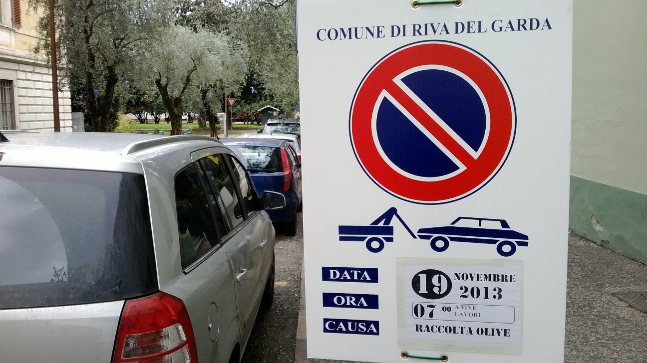 (Cliccate sulla foto, ingranditela!) Foto a sinistra; brevi riflessioni a destra. Mi ha colpito. Mi ha colpito questo cartello “Divieto di sosta per raccolta oliveâ€. Già , perché a Riva del Garda gli ulivi in strada sono tanti, ed il Comune ne concede una sorta di usufrutto a privati volonterosi. Ma a mio avviso il significato più pregnante non è quello “economicoâ€: raccolgo le olive, le porto al frantoio e ne ottengo qualche fiasco di ottimo olio. Il senso più importante dell’operazione è che la città è viva, come i suoi ulivi, e soprattutto che la “la città è mia†e il mio mondo non si esaurisce con il mio “privatoâ€. La città , in altre parole, non è tutto ciò che sta intorno al “mio privatoâ€. Fosse così anche per lo Stato!