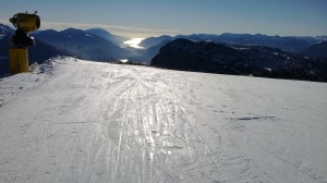 … ed anche solo una semplice foto con allegata una breve considerazione e non solo post con foto allegate. Ecco raga … che fortuna essere vecchietti in pensione! Già , perchè questa mattina dopo avere pubblicato i due post precedenti; dopo essere “risalito†da Riva del Garda a Trento; “fra le ore†sono stato in Paganella a sgranchirmi gli … sci! Non c’era molta folla (quasi nessuno). Ho sciato tre ore con il mio amico Claudio. Abbiamo soccorso un tale che era caduto (telefonato ai CC di Cles che hanno mandato il toboga dei CC della stazione sciistica); abbiamo mangiato un’ottima zuppa d’orzo alla Malga Zambana. Tutto qui. La foto? ah. già … dimenticavo … il Lago di Garda come uno specchio d’argento! Lo so … lo so … nello scatto ho ripreso “troppa neve†… ma che volete … Claudio teneva una mano a riparare l’obiettivo dal sole, ed io, con il sole in faccia non riuscivo a regolare l’inquadratura. Ma quello che conta è il pensiero, vero? Ed io ho pensato a voi, mie lettrici e miei lettori, e mi sono detto: questo scatto lo devo regalare a tutti loro!
