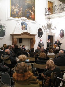 La sala, stracolma. Conviene infatti arrivare molto prima, per assicurarsi i posti migliori. L’orario. L’inizio è fissato per le 10,30, il che comporta che alle 12,00 – a concerto in corso – giunga il suono delle campane …. Forse si potrebbe anticipare l’inizio alle 10,15 …